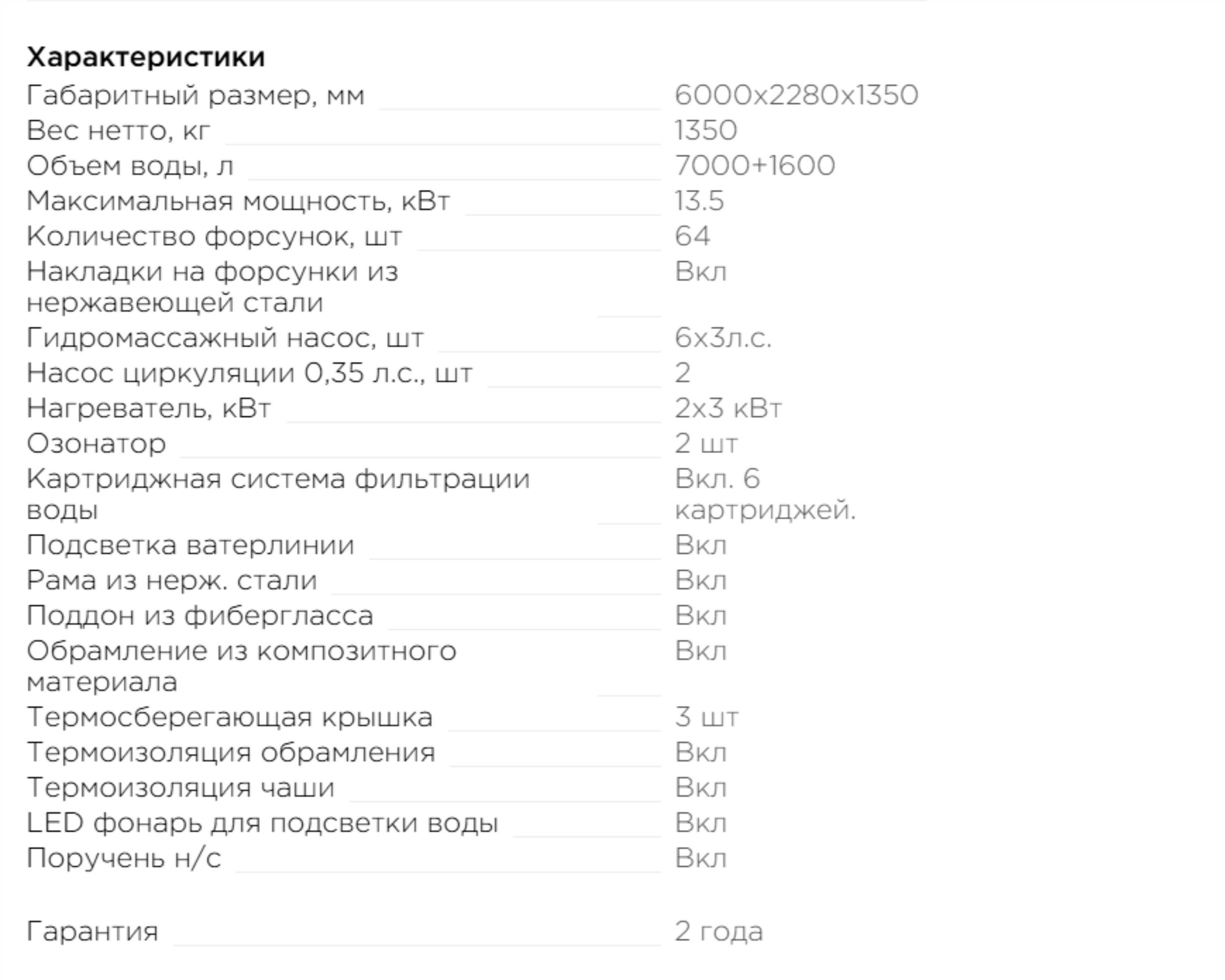Акриловая чаша Aristech (США) наиболее устойчива к перепадам температуры и выцветанию. Чаша имеет гладкую непористую поверхность, в которой не образуются водоросли и бактерии. Система фильтрации с применением озонатора позволяет использовать минимум химии. В бассейне используется оборудование от ведущих производителей: система управления корпорации Balboa Water Group (США) и насосы LX. Жесткая конструкция бассейна, реализованная с помощью интегрированной рамы из нержавеющей стали, обеспечивает надежную фиксацию чаши и долговечность бассейна.