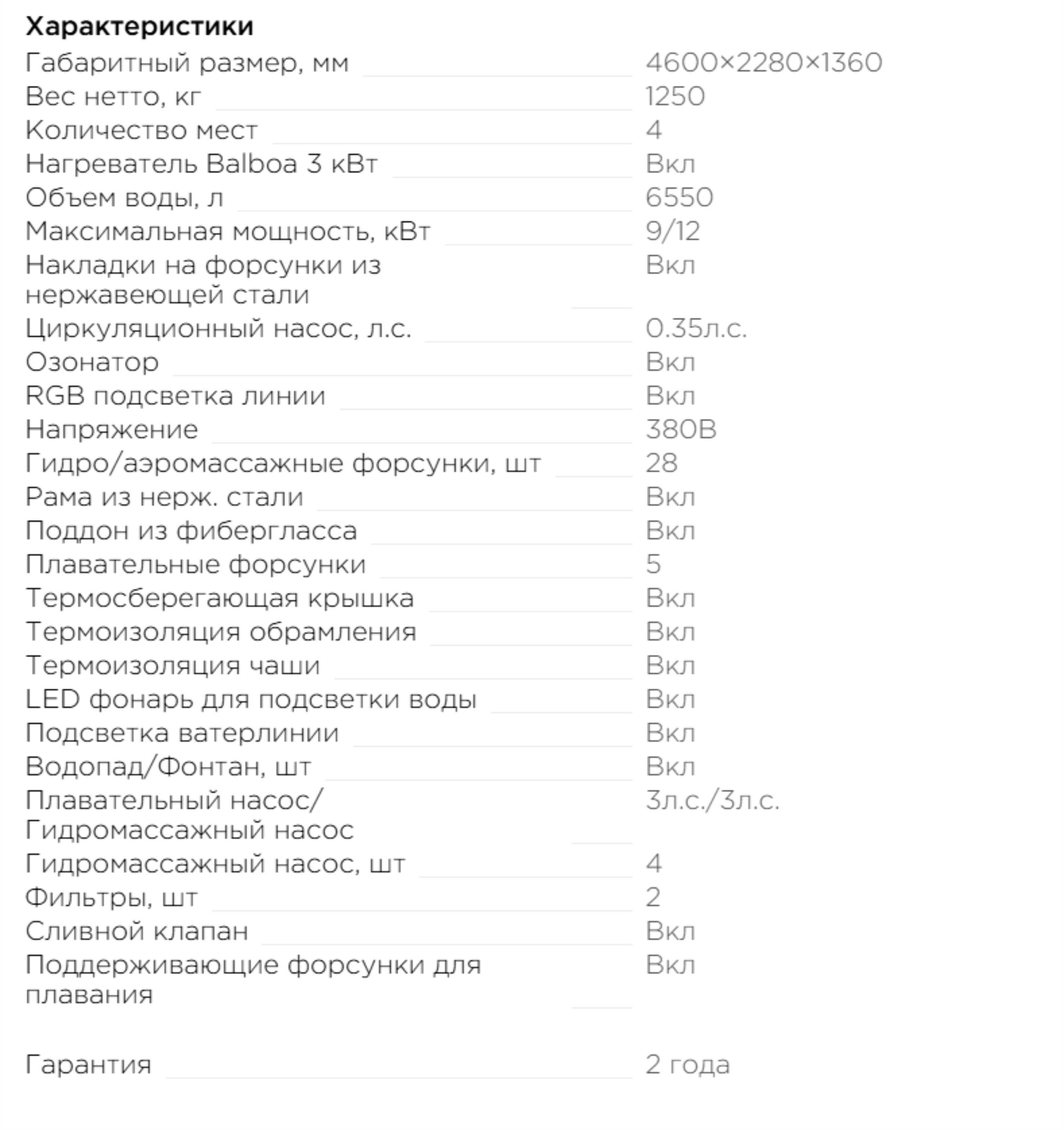 Акриловая чаша Aristech (США) наиболее устойчива к перепадам температуры и выцветанию. Чаша имеет гладкую непористую поверхность, в которой не образуются водоросли и бактерии. Система фильтрации с применением озонатора позволяет использовать минимум химии. В бассейне используется оборудование от ведущих производителей: система управления корпорации Balboa Water Group (США)и насосы LX. Утепление бассейна по принципу термоса позволяет минимизировать расход тепла, соответственно и снижение электроэнергии и пользоваться им в любое время года.