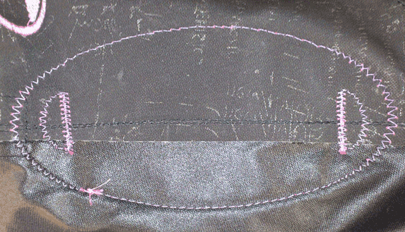 Сани дополнительно оборудованы буксировочным узлом и тремя ручками (ниже приведены фото ручек с верху и с изнанки саней, ручки пришиты насквозь вместе с основанием к оболочке надувных санок и усилены закрепочным швом в наиболее нагруженных местах).