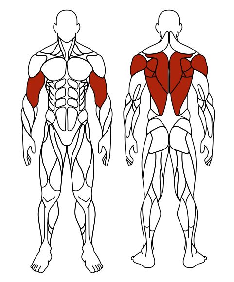 Тренажер укрепляет широчайшие мышцы спины, бицепс и задние пучки дельтовидных.
